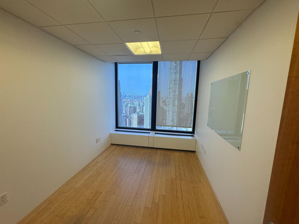 This partial 37th floor at 3 Park Avenue offers 5,035 RSF of finished office space requiring renovation. The layout includes multiple private perimeter offices with floor-to-ceiling windows and bamboo hardwood floors. Interior bullpen areas have glass partition walls. Dedicated conference rooms include glass whiteboards. A full executive kitchen features granite countertops, stainless appliances, and island seating. Private bathrooms are included. Corner offices face southwest toward the Empire State Building and west toward the Hudson River. Ownership will modify the space on behalf of a credit tenant.