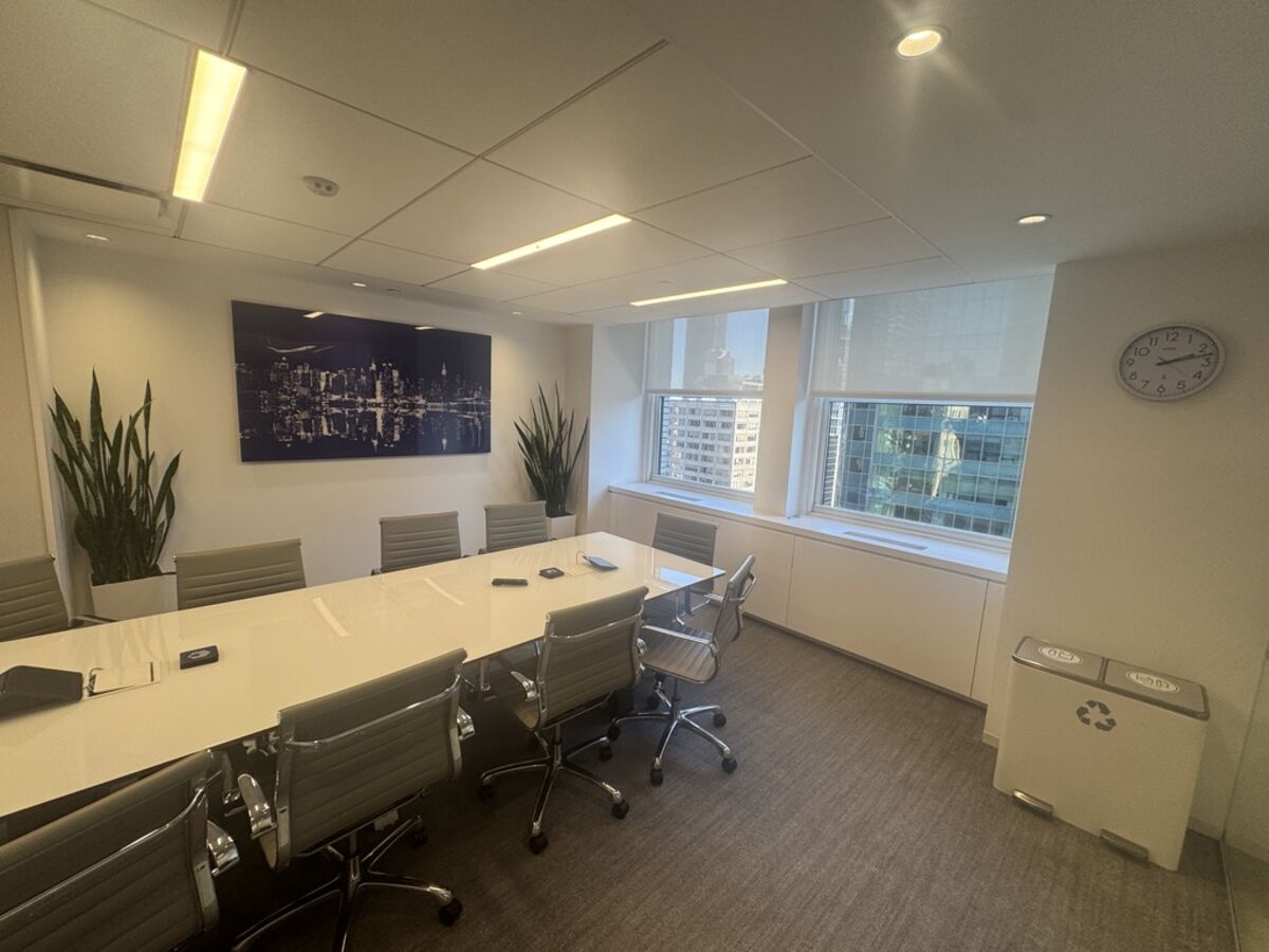 This 4,623-square-foot office occupies part of the 31st floor at 405 Lexington Avenue. It’s available as a sublease through August 2028. The space is move-in ready and can be delivered furnished. Floor-to-ceiling windows face north and east. Natural light fills the space. Skyline views stretch across Midtown. The layout includes partitioned offices, a conference room, and open work areas. A kitchenette has a refrigerator, microwave, and dishwasher. Drop ceilings and carpet run throughout.