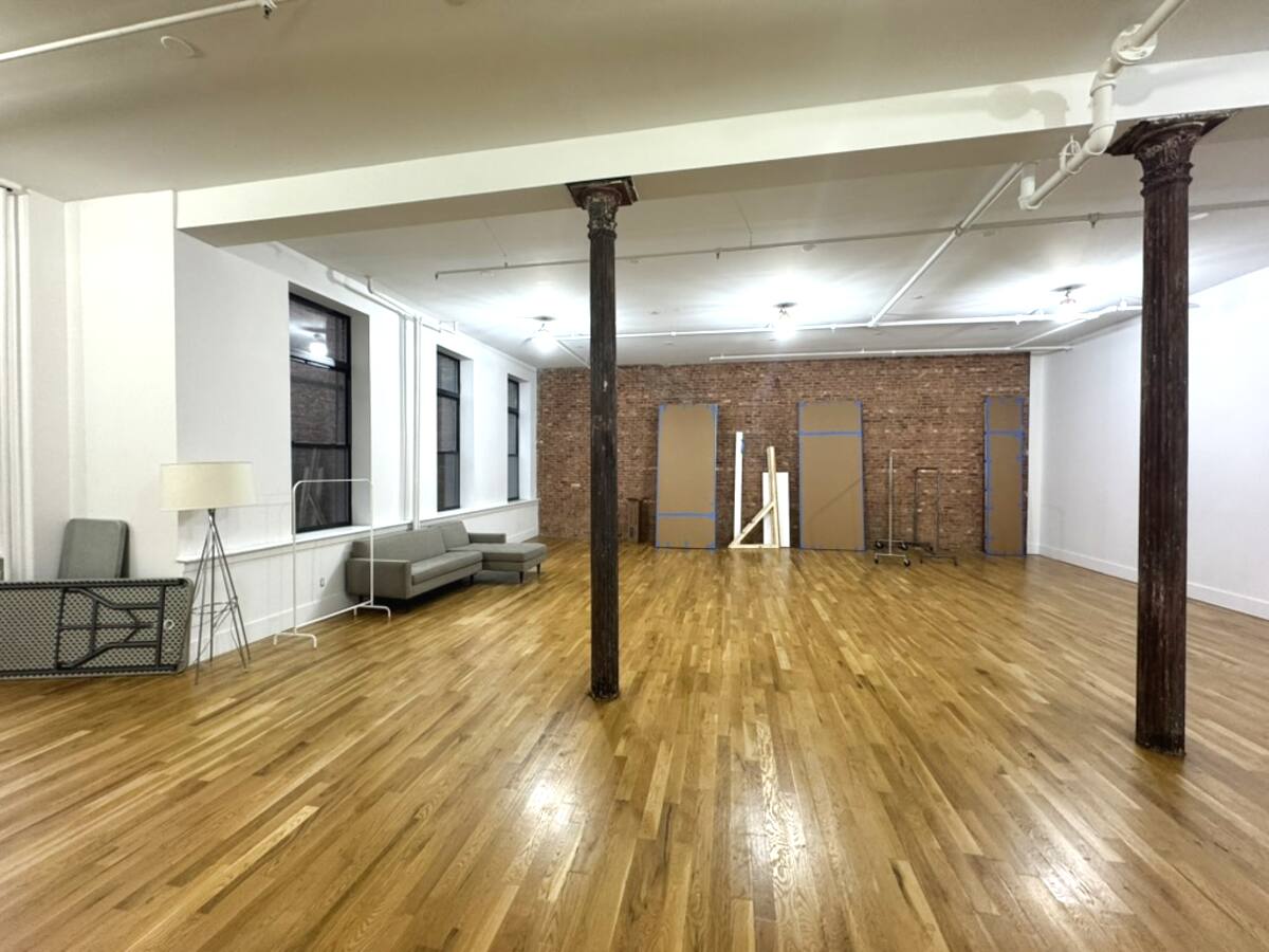 This 3,500-square-foot office occupies part of the 4th floor at 873 Broadway. Exposed brick walls and cast iron columns define the loft layout. Fourteen-foot slab-to-slab ceilings run throughout. Large windows on multiple exposures provide natural light. Hardwood floors span the space. A private bathroom serves the floor. The layout works for creative firms and agencies.